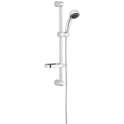 Die Brausestangengarnitur besteht aus einer 60 cm langen Brausestange (Ø 25 mm) mit Seifenschale, einer verchromten Multifunktions-Handbrause mit 5 Funktionen und einem Brauseschlauch aus Metall in 150 cm Länge. Zusätzlich verhindern die praktischen Anti-Kalknoppen effektiv lästige Ablagerungen. Die Garnitur ist passend für Anschlüsse mit 18,6 mm (G 1/2). Im Lieferumfang ist das Befestigungsmaterial enthalten.