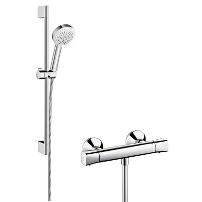 Wer das Thermostatset Hansgrohe Crometta 100 Vario kauft, kann sich auf praktisches Set für die Dusche freuen. Dank der Brausestange (0,65 m) und dem Brausehalter (Schieber), dessen Neigungswinkel um 45° verstellbar sowie nach links/rechts bzw. oben/unten schwenkbar ist, findet der Duschkopf inkl. Brauseschlauch optimalen Halt. Auch das Thermostat mit Sicherheitssperre bei 40° bietet zusätzlichen Komfort und Sicherheit