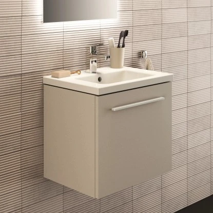 Der wandhängende Möbelwaschtisch setzt sich in Szene und ist kombinierbar mit einem Möbelwaschtisch-Unterschrank.