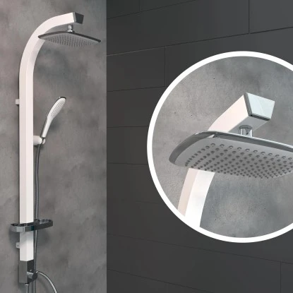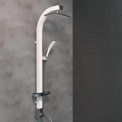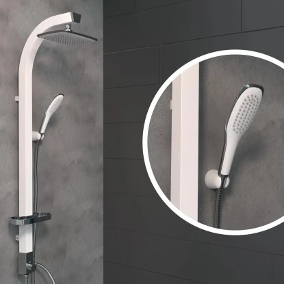 Die Brausestange aus Aluminium ist durchgängig in Weiß gehalten. Details wie Umsteller, Kopfbrause, Seifenschale und Zierseiten sind verchromt abgesetzt und runden das Bild ab.