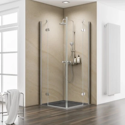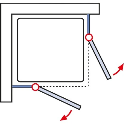 Der MasterClass Eckeinstieg besitzt zwei nach außen öffnende Drehtüren mit einem großzügigen Einstieg. Der verdeckte Heb-Senk-Mechanismus der Türen sorgt für eine erhöhte Dichtigkeit sowie ein zuverlässiges Schließverhalten. Durch die vormontierten innen bündigen Halbkreis-Scharniere ist eine einfache Pflege und eine einfache Montage der Dusche gegeben. Diese liegen mit der Glasfläche bündig auf. Dadurch können Wassertropfen einfach entfernt werden. Die im Lieferumfang enthaltenen Stabilisationsbügel garantieren einen sicheren Stand der Dusche.
