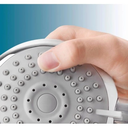 Die runde Handbrause zeichnet sich durch ein zeitloses Design aus. Durch die flexiblen Gumminoppen ist sie leicht zu reinigen.